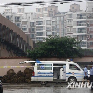 6月27日,一辆救护车正在事发现场等待被埋者被救出。当日6时左右,上海闵行区莲花南路罗阳路口一幢13层在建商品楼发生倒塌事故,目前已造成一名工人死亡,事故原因尚在调查中。