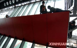 近日,建设中的上海2010年世博会中国馆正式进入装修阶段,中国馆主体建筑正南方向中间位置的第八、九层开始安装红色的外立面装饰板。