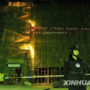 据正在现场的中石化第十建设公司项目经理宋纯民说,事故发生时他们正在浇灌备煤框架,中午12时20分左右突然发生塌陷,在场的51名施工人员立即撤退,但有两名工人被困在离地面20米左右的脚手架中间。截至发稿时,其中一名受困人员被救出,但被送往医院后救治无效死亡。目前,救援人员还在进行紧张的抢救,事故原因正在调查中。这是事故现场。