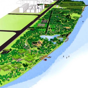 在功能上,充分利用夹河景观带的开发和建设,将三区交汇的非城市中心区域作为一个景观上的边缘情境重点加以刻画,形成一处由自然水岸风光、人工雕琢和城市文化因素组成的引人入胜的混合景观带及大型水域生态空间,真正发挥出“界河”效应,有效拓展区域功能,促进三区融合。在设计构思上,分别以“滨水景观”和“城市阳台”为出发点,通过码头、湿地、戏水广场等亲水空间的塑造,强化滨水景观;同时提供充足的林下活动、游戏、思考、运动等户外场所,打造三区人民资源共享的“城市景观大阳台”。 这次方案设计,延续了城市及场地肌理,创造可持续性生态环境,以城市文化为载体,创造人性化滨水空间。其中,保留了现有场地内的高尔夫球场、老河道天然湿地、林地及大树;依据现状地形,在保护、保留的基础上,对水体及微地形进行改造;根据现状条件及相关要求,划分了不同的功能区域,布设游路系统,增加了健身、游憩场地;并赋予场地以文化性,适当设置能够体现当地文化特色的景观雕塑及构筑物和休息设施;通过植物改造,营造滨水植物景观,赋予场地以生态性,提升场地识别性及认同感。 该方案通过实施后,将成为夹河这条母亲河上的醒目亮点,成为集绿化美化、旅游休闲、商业服务、文化艺术等为一体的生态之河、景观之河、文化之河,为五区的融合发展带来无限生机。