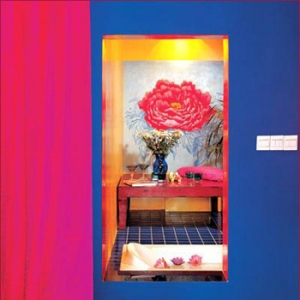 一踏进门,恍若隔世。一个极浓艳的、有蠢蠢欲动的香气的房间,简直惊世骇俗:极纯的蓝、极艳的粉、极亮的明黄,金色的顶,黑色的地,纯粹得让人窒息的色彩,就这么轰轰烈烈地蔓延,和随处可见的藏式家具一起,把空间装得满满的。加上幽幽暗暗的灯光,曲曲折折的通道……