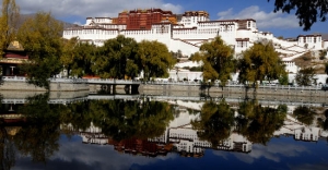 10月22日,工作人员在粉刷布达拉宫外墙。夏天,布达拉宫的白色墙体被雨水冲刷,会出现道道雨痕。每年雨季之后,工作人员都会用当地的白灰(一种藏族传统建筑涂料)进行粉刷,使冬季的布达拉宫显得更加“洁白”。