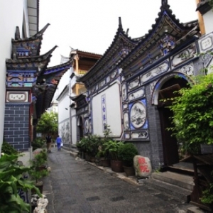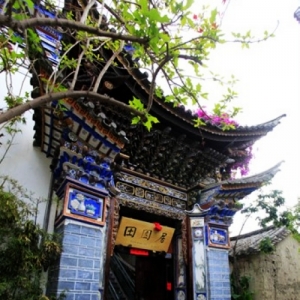 白族民间建筑,多为二层楼房,三开间,筒板瓦盖顶,前伸重檐,呈前出廊格局。墙脚、门头、窗头、飞檐等部位用刻有几何线条和麻点花纹的石块(条),墙壁常用天然鹅卵石砌筑。墙面石灰粉刷,白墙青瓦,尤耀人眼目。山墙屋角习用水墨图案装饰,典雅大方。木雕艺术也广泛用于格子门、横披、板裾、耍头、吊柱、走廊栏杆等,尤以格子门木雕最为显眼。张府门头上的雕花十分精致,层数也多,色彩浓郁热烈,颇具民族特色。据当地人介绍,张家刚刚办完喜事,抬眼望去,大门上悬挂着一块“田园居”的匾额,匾额上果然还挂着红绸带,透着一股喜气。 张建春是一位古建筑设计家,八年时间,他投资了五千多万元,终于把自己的家改建成一座庞大的茶花民居——“张家花园”,实现千年大理白族民居的梦想。这也是中国最大白族民居的落成。听说全国各地的记者来了,张建春的老母亲迎了出来,并未我们打开了另一座庭院。小院不大,亭台、假山、流水、花草、树木呈现得错落有致。眼前的景象,再一次的吸引了老记们的镜头,就连张老夫人也成了大家争相合影的对象,想把这份福气带回家吧!