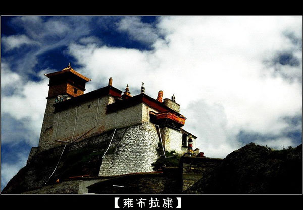 雍布拉康位于泽当东南5公里处,是第一代吐蕃赞普所建王宫,为西藏历史上第一座宫殿,始建时间约为公元前2世纪。雍布拉康分前后两部分,前部为一幢三层楼房,后部是一座高约30米的碉房雄踞山巅。前部一进门是门庭,庭外有带檐小平台,往里是宽大的殿堂,主要供奉三世佛像及松赞干布、文成公主像。二楼前半部为三面环绕矮墙的平台,后部是带天井的回廊和大殿,殿高2米左右,里面供奉着强巴佛、宗喀巴、莲花生、文殊菩萨等;还有一间专供历世达赖喇嘛来此礼佛时的卧室;三层后部是廊院,可通向碉楼。碉楼的上层,四壁绘满了色彩绚丽的壁画。整个建筑墙体为纯石结构,坚实耐久,宫顶系上木架构。整个建筑居高临下俯视四周,依山长守、托壁善攻。一条石阶从平川重叠而上,形成一夫当关、万夫莫开的险势,是古代典型的城堡建筑模式,也是王权至高无上的体现。