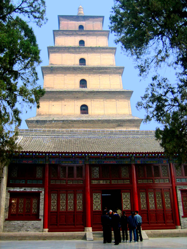 古城西安南郊雁塔路南端的慈恩寺内,矗立着古朴雄伟的大雁塔。它是西安现存最著名的古塔,被视为古城的象征。大雁塔,全称“慈恩寺大雁塔”,楼阁式砖塔采用磨砖对缝,砖墙上显示出棱柱,可以明显分出墙壁开间,是中国特有的传统建筑艺术风格。 据史书记载,慈恩寺始建于隋开皇9年(公元589年),初名无漏寺。唐贞观二十二年(公元648年),唐高宗李治做太子时,为追念他母亲文德皇后而扩建,寺院的规模很大,共有13个院落,897间房屋,云阁禅院,重楼复殿,异常豪华。唐王朝灭亡后,大慈恩寺也渐渐颓废毁坏。现存的寺院建筑大部分是明代时重修的。它北面正对大明宫含元殿,附近环绕曲江池、杏圆和乐游原,风景秀丽迷人。大雁塔是慈恩寺的第一任主持方丈玄奘法师自印度归来,带回大量梵文经典和佛像舍利,为了供奉和储藏这些宝物,而亲自设计并指导施工的。玄奘被尊称为“三藏法师”,曾排除九九八十一难前往西天取经。唐高宗和唐太宗曾亲自撰写《大唐三藏圣教序碑》和《述三藏圣教序记碑》。 大雁塔是楼阁式砖塔,高