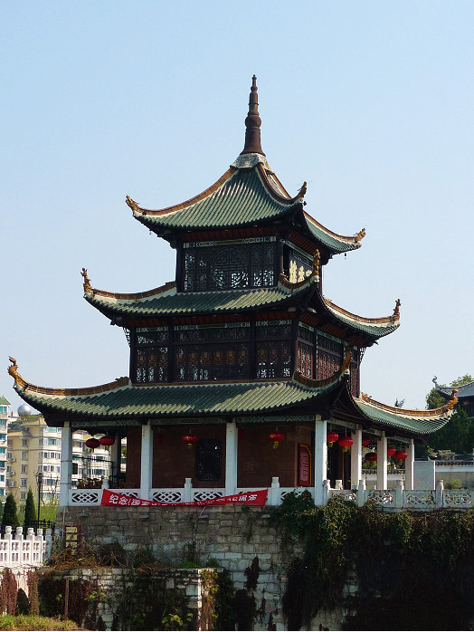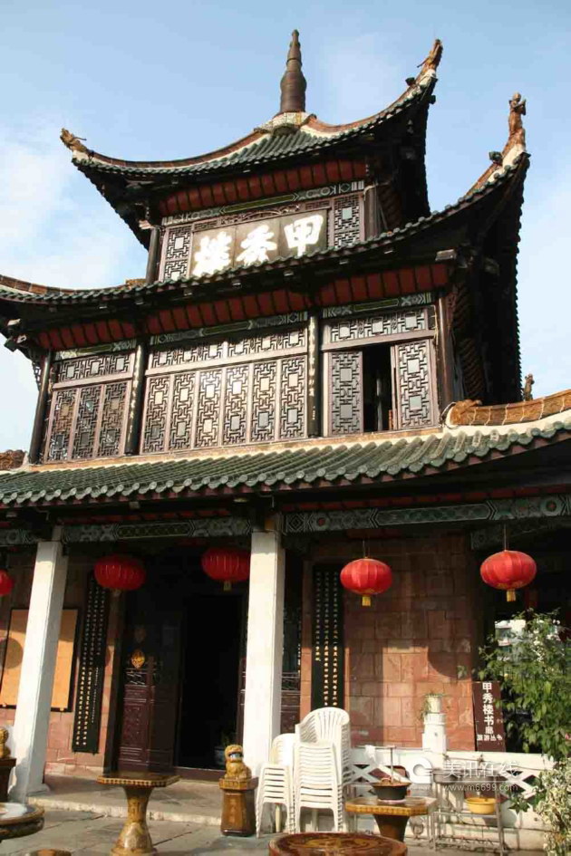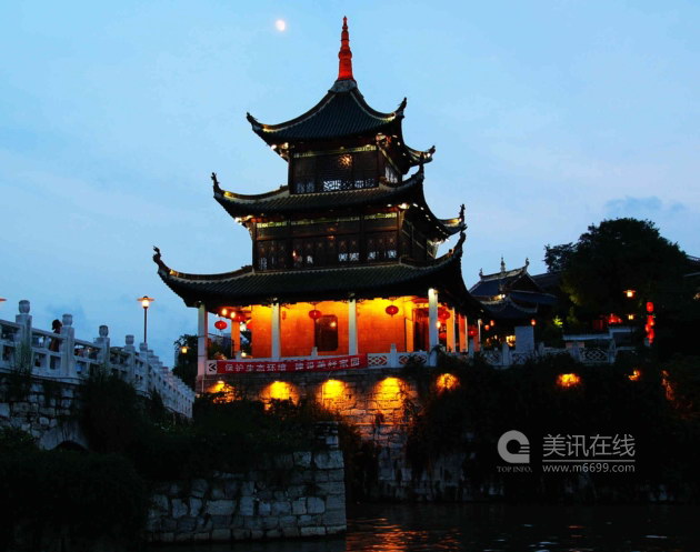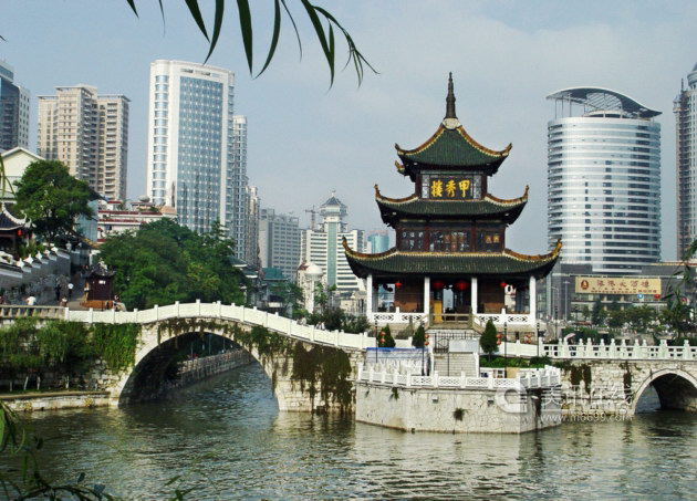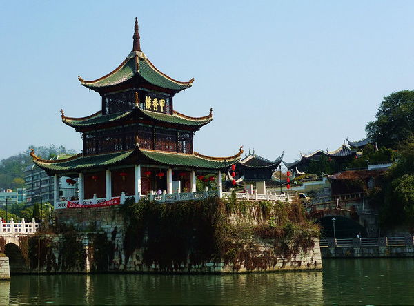甲秀楼是三层三檐四角攒尖顶阁楼,这种构造在中国古建筑史上都是独一无二的。我们可以在这一特色上大做文章,来提高此楼的知名度和可鉴赏性,以吸引广大的旅游爱好者和建筑专家来观光、考察。楼高约20米,飞甍翘角,12根石柱托檐,护以白色雕塑花石栏杆,翘然挺立,烟窗水屿,如在画中。登楼远眺,四周景致,历历在目。浮玉桥如白龙卧波,全长90余米,穿过楼下,贯通两岸。桥上有涵碧亭,桥下有涵碧潭、水月台,桥南有翠微阁,遥相呼应。 甲秀楼分为三大部分:第一部分浮玉桥;第二部分甲秀楼主体建筑;第三部分翠微园。浮玉桥头立有“城南遗迹”石木牌坊,牌坊中央设有“城南遗迹”四个大字,桥上建有“涵碧亭”。主体建筑甲秀楼飞甍翘角、石柱托檐、雕栏环护。翠微园是一组由拱南阁,翠微阁,龙门书院组成的明清古代建筑群。同时新建的贵州少数民族传统服饰陈列院,收集收藏了贵州省苗族、侗族、彝族、水族、革家、土家族、布依族等民族传统服饰、手工刺绣品、民间蜡染数百余件,令人叹为观止。该馆所陈列展示的民族传统服饰和民族工艺品,是贵州少数民族文化艺术的体现,也是贵州各少数民族的骄傲。 甲秀楼-历史传说 传明朝年间,贵阳这个地方出了一位状元。官府为了讨好他,愿出巨资修一座藏书楼,作为他读书游艺的地方。为此,知府大人请了三位风水先生,在全城察看了一番之后,认为南明桥那里是块风水宝地,回来向知府大人禀报,确定就将藏书楼修在南明桥上,并且取名叫“甲秀楼”。 地点确定后,知府大人又请来了本地最有名的一位石匠和二位木匠,带着他们来到南明桥上看一回,便下令选个黄道吉日动工修建。 知府走后,石匠师傅打了一壶酒,把木匠师傅请到家里,两个人喝了三盅之后,石匠叹口气对木匠说;“兄弟,知府大人下令造楼,哪个敢违抗。只是这南明河上,眼下就只有这一座桥贯通南北,桥上要是再修了藏书楼,这桥就成了状元公的地盘,交通要道不就成了一块禁地吗!日后哪个还敢从桥上经过?有钱的倒可以坐船摆渡,没钱的呢,就只好望河兴叹了。尤其是那些进城卖菜的、推车挑担的,就更不方便了。 木匠说:“大哥说得有道理,这南明桥确实是个交通要道;只是知府大人已经画好了圈圈,你我兄弟二人又怎敢不照办呢?” 石匠说:“顾不得知府大人了。我们还得替百姓着想,不然,日后你我世世代代都要背骂名。” 木匠说;“听大哥的意思,这藏书楼不修了?” 石匠说:“当然要修,只是换个地方就是了。” 木匠问:“换在哪点?” 石匠说:“沿河下去一百二十步,就是块好地方。”木匠觉得这主意好,就决定这样办。 当天晚上,贵阳城内阴云密布,大雨瓢泼。这两位能工巧匠把自己的师兄师弟,徒子徒孙召集到南明河边,连夜 拦河修桥,凿木造楼。远近的居户人家本来就担心知府大人在南明桥上造藏书楼,断了日后过河的通路,现在听说两位匠人另选了一块地方造楼,一个个都冒着风雨,赶来相助。那天晚上,也不知道有多少男女老少在河岸边担石挑土,架梁立柱,只听到人声沸腾,惊天动地。等到东方发白,大雨停了的时候,一座精巧玲珑飞雕梁画柱的楼阁已经矗立在碧波荡漾的南明河新桥的鳌矶石上了。 当“甲秀楼”三个金光闪闪的大字出现在楼阁上之后,知府大人才闻讯来到南明河边。他见藏书楼没有建在南明桥上,十分恼怒,立刻传令叫两个匠人来回话。衙役们四处寻找,就是找不到那个石匠和木匠的踪影。知府大人没有办法,只好将就拿这座九眼新桥上的藏书楼给状元公了。 后来人们才知道,这两位匠人因为害怕官府追究,造完楼后,就带着妻子儿女远走他乡了。所以直到今天,人们一直不知道修造甲秀楼的两位匠人倒底姓什么,叫什么。