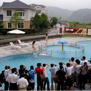 6月20日,湖北宜昌市锦江房地产开发公司举办人体模特摄影比赛来展示楼盘,吸引了约100名摄影师前来抢拍。