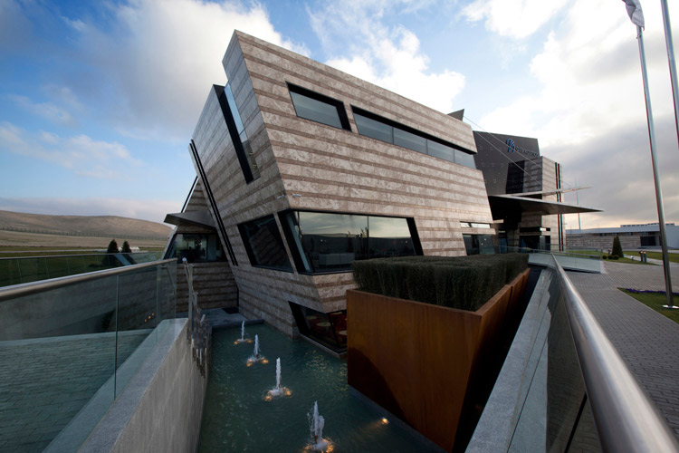 这一建筑的设计如同一块落入大地的巨石,并被分裂成4块不同的体量,形成了解构主义风格。除此以外,还有一些彰显未来主义和至上主义风格的元素。室内的设计也体现了以上提到的这几种风格。