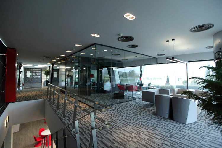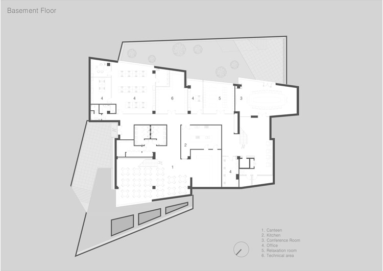 主楼分有卫星控制中心、办公室和技术部、行政办公室、会议厅和餐厅。主楼共三层:地下室、一层和二层。这种切割体块使建筑免受北风侵袭,减少了热消耗,同时和周围的环境构成了相协调的整体风格。