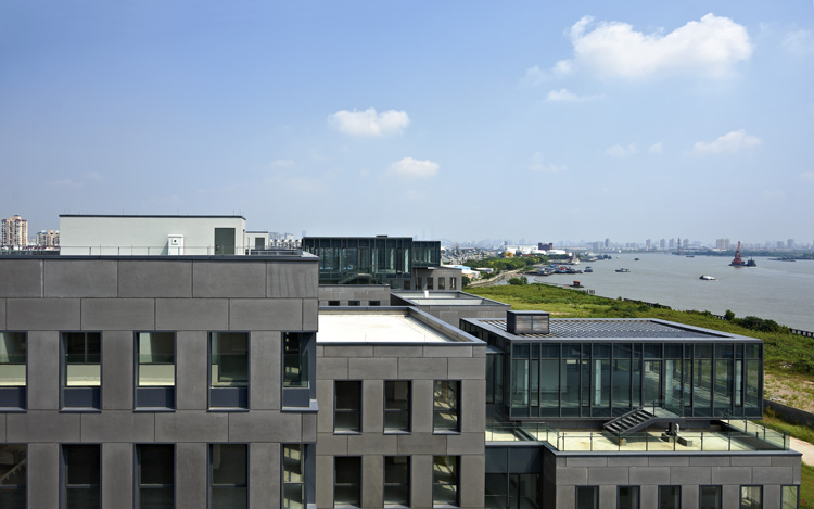 富于变化的空间体量其实受到一个严格的模数系统的控制,墙面上均布的落地长窗成为一个整体的背景,只是内平与外平的不同处理带来了光影上微妙的变化;而景观阳台上内凹的大玻璃洞口和顶部悬浮的全玻璃盒子引入了大尺度的异质元素,与均质的背景之间形成强烈的张力,并提示了内部使用空间公共性的不同。由于公安系统的统一要求,水上公安警署外墙使用简单的白色涂料;而其余四栋楼的外墙都使用的是大尺寸的灰色清水预涂装水泥压力板简易干挂系统,以求得造价与品质的平衡。