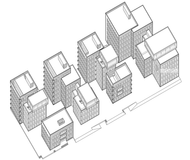 由于场地狭小,五家单位的办公楼需要各自独立,而它们的规模又有巨大的差异(最小的800平米,最大的6000平米,其余在2500-3000平米),我们提出一种微观都市主义的策略来回应这个高密度的项目,并以开放街区的模式来形成各自独立办公楼的资源共享,同时建立场地与建筑同江景之间的丰富勾连。我们利用滨江道路与内侧基地1米的高差,在基地上形成一个比滨江道路高出0.9米的绿化景观平台,这个平台利用坡道台阶可从滨江道路方便地进入;而平台下部则是一个五家共享的半地下车库,从西侧基地内部道路下半层就可到达。平台上的5栋大小不一的办公楼由南到北错落布置,都由3-6层的尺度相似的体块错叠连接而成,并由西向东跌落。这样的布局方式既使得更多建筑界面可享受临江景观,也消除了规模差异可能带来的尺度失控,建立了统一而又富有变化的空间特质,并在密集的体量堆积中形成了建筑之间蔓延渗透的庭院空间,成为建筑与城市之间的过渡。
