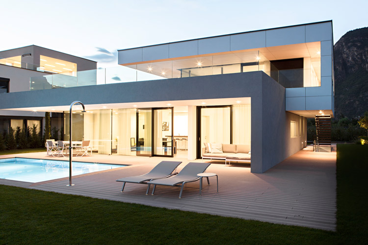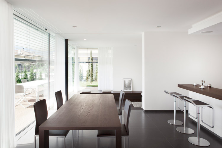 这栋别墅通体为纯白色设计,内部与外部空间完美的融合于一处:白色的立面、白色的内饰、连泳池边的露台地板也全部采用白色;业主对于白色的偏爱可见一斑。建筑师希望设计能够融合内外的分界。精心设计安排的水池、草坪和花园等要素完美搭配,有一种浑然天成之感;从工程和建筑角度分析,这一别墅建筑的体量设计非常紧凑,而且三层玻璃及门窗是一种绝缘设计。