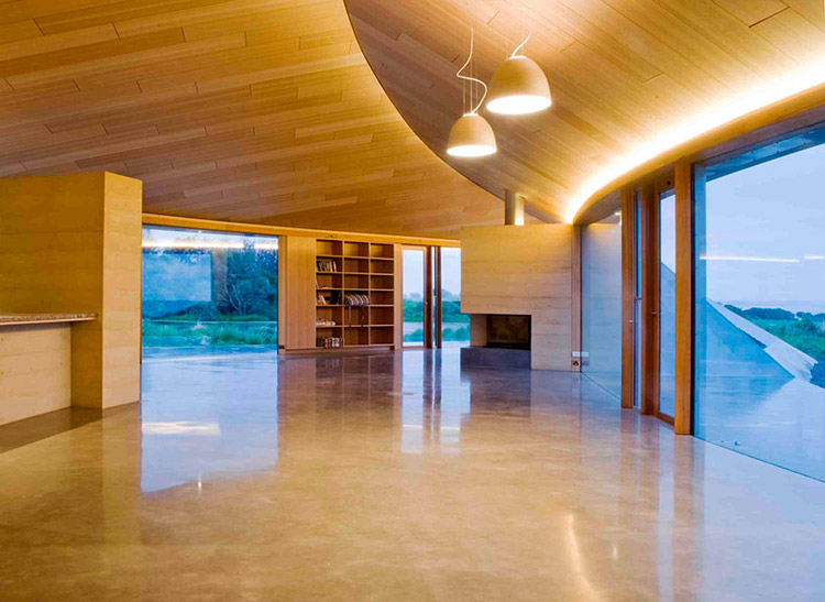 项目名称:Crescent别墅 澳大利亚建筑师james stockwell在维多利亚南部海岸设计了一座月牙形的别墅。这座住宅的业主希望能够 “拥有全景视野,在住宅中可观赏到各个方向的沿海风景”,并让住宅建筑本身成为“景色的一部分”。 建筑从景观中缓缓升起,半圆形的平面向海面全方位开放,同时还有一个内嵌的户外庭院,周围墙面可以抵御强劲的海风。建筑师选用当地材料,用传统的手工技艺创造了具有当代感的设计风格。光滑的混凝土外墙与页岩地质相呼应,室内采用压缩热砂墙,像沙丘一样给居住者带来温暖的感觉。室内空间运用了大量木材饰面,由澳大利亚硬木和当地的青石组成。双层玻璃和隔热层让建筑变的更加节能,还带有自然的高防火等级。流线形的屋顶系统由二维面板以及板条、椽子和波纹金属板组成——配合当地的方法建造而成。 这座融入到乡村景观中的住宅,连续的建筑形态环抱着周围自然景观,同时创造了一个内嵌式的户外小庭院,窗户嵌在波纹金属板下方,木质天花板给混凝土结构的建筑带来温暖的感觉。