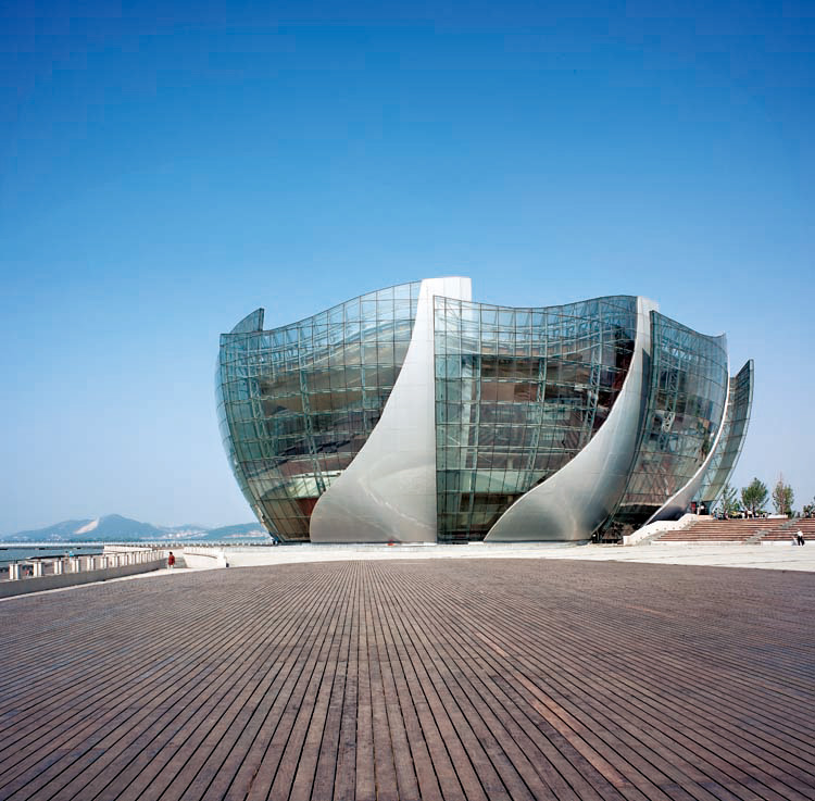 ![]() 项目名称:徐州音乐厅 设计者:清华大学建筑设计研究院 主创人员:祁斌、邹晓霞、吕雁、王明帆、程刚、杨伟勤、聂洪涛 委托人:徐州市建设局 项目地点:江苏 徐州 建筑面积:13 300m2 设计时间:2007—2008年 建成时间:2011年 徐州音乐厅建造在一片人工填湖形成的临湖半岛用地上,设计取意城市的市花——紫薇花的形态。建筑整体犹如层层展开的花瓣,勾勒出花朵婀娜的形态,绽放在云龙湖平静的水面上。开放的室外看台及休闲空间环绕建筑主体,以美丽的云龙湖为舞台背景,成为城市公共演出的开放舞台,也为市民提供一处观湖休闲的公共空间。建筑契合场所、地形、功能特征,形成具有象征性的理性的建筑形态,融入山水城市景观,象征着进取的城市精神。