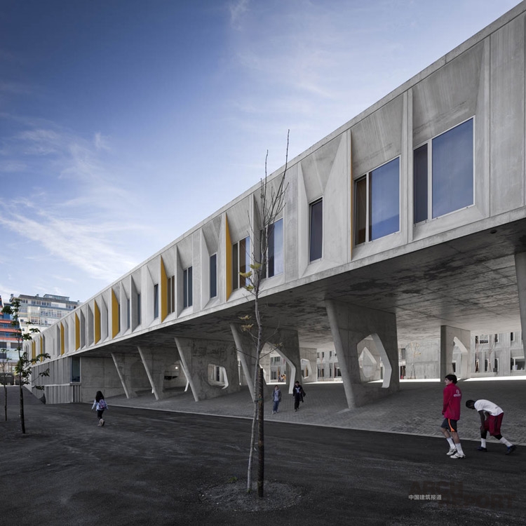 设计者:CVDB arquitectos 设计团队:Cristina Veríssimo, Diogo Burnay, Tiago Santos, João Falcão, Rodolfo Reis, Joana Barrelas, Adam Pelissero, André Barbosa, , Ângelo Branquinho, Ari Nieto, Guilherme Bivar, Hugo Nascimento, Inês Carrapiço, Irune Ardanza, José Maria Lavena, Leonor Vaz Pinto, Luigi Martinelli, Miguel Travesso, Silvia Amaral, Silvia Maggi 景观设计:F&C Arquitectura Paisagista 建筑面积:15 800㎡ 建设时间:2010年—2012年 摄影:invisiblegentleman.com 这个中学位于葡萄牙里斯本弗莱雷历史区域的边缘,占地1 738公顷,边界紧靠陡地。最初学校始建于1986年,拥有5个建筑,其中一个是主体建筑,剩余四个两层楼高的附属建筑沿东西轴线排列。教学楼彼此之间,以及与操场的关联很弱。 2007年葡萄牙启动“中学现代化”的计划,这个学校位于其中,空间要求被重新整顿,功能明晰且与社区联系紧密。 新的改建设计将所有的教学楼实现为一个单体建筑,通过这个建筑的内廊联系原本各个建筑,这些开放的内廊形式多样,仿佛是一个学习的街道,街道在贯穿起几个内部的,可提供非正式学习空间的公共空间。学习的街道具备多种可能性,促进各种教育活动,促使与社区发生关联。 建筑围绕着一个中心庭院“学习广场”,学习广场可以看做学习街道的延伸,同时加强学校与自然的联系。这些空间无一例外的支持学生的各种使用:行走,玩耍,交谈等等。 建筑外表皮由现浇混凝土和混凝土预制构件组成,使得成本与维护达到最低。混凝土板经过精心设计,与太阳方位形成微妙的关系。内部空间也选择了十分耐用的低廉材料。多功能厅墙上是木材吸音板,左右主要交通空间墙壁也做了声学处理。内部公共空间采用了明亮的色彩。
