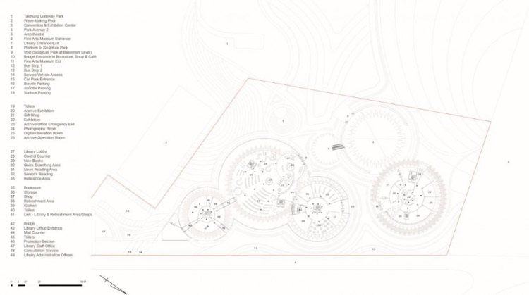 台中市文化中心坐落在城市北边通向市内的城市公园里,从总体规划上看为城市提供了一个公共枢纽。考虑到城市肌理的延续,设计方案反映出新的城市理念,即将自然和创新科技相结合。