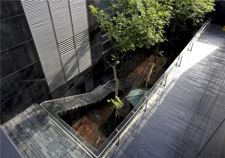 景观设计是设计的一个重点,目的是让人行走在建筑之间,感觉不到周围建成建筑的规模,从而创造一个对周围环境影响很小的空间。通往二层广场的坡道提供了一个扩展的公共空间,二层的建筑规模较小,更加私密。坡道广场上行和下行通道不仅突出了中心轴线,同时也有助于提升用户的方向感,大概指明步行通道的方向。在一个高度密集的城市环境中,本案建筑希望能与现有的建筑很好地融合在一起,同时还要创造一个社区空间,为周围的环境带来新特色。