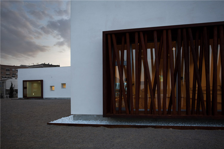 舞蹈学院与当地的音乐学院相隔不远,而正是这样的艺术气氛使整个Lliria这个小镇以“音乐之城”而著名。这个单层的舞蹈学校由两个完全不同的建筑体量构成,而在中间连接它们的是3个透明玻璃盒子样式的房子:而这些玻璃小房屋又连接了可以直接通向舞蹈教室的更衣室。其中的一个建筑体量面向Trencall大街,呈水平方向布局,同时正对街面的大玻璃增强了内部与外界的联系,从外面可以清晰看到大厅、接待室、办公室等区域的情况。第二个建筑体量位于第一个的后方,是一个小立方体。里面有三个教室,一个位于中心,其他两个分布在两侧,形成对称分布。透过教室的大玻璃同样可以欣赏到花园及街道的自然景观。这一朝外的玻璃幕墙还设有一些管状的围栏,这样就阻挡了外界强烈的日光照射,并保证了训练的封闭性。