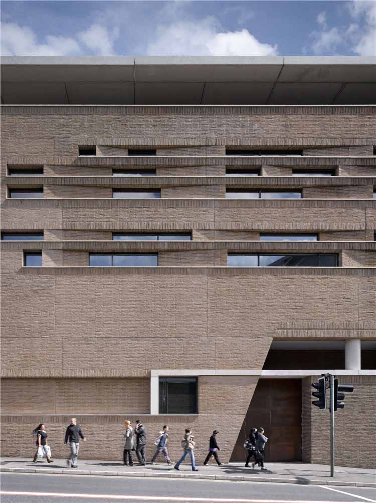 位于学校西南角的这所建筑面临了许多挑战,因为用地和面积的限制,建筑上部分便做出悬挑增加面积。因为地处城市中心,对噪声的限制要求很高,建筑内部的所有声乐教学室和表演场所都采用了独立的结构。大型音乐厅则拥有完全独立且被隔离的内部结构。场地在一个高差超过6米的坡上,建筑师利用这一个特点创造出建筑平面布局的多样性,在下层安置音乐和教学课堂,以及相关服务空间。一座高架桥从学校南部探入建筑内部,方便南部师生日常访问。建筑的造型灵感部分来自五线谱,钢琴,部分来自周围的古老建筑。