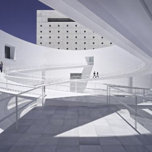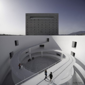 Andalusia的历史博物馆位于2001年建成的CAJA GRANADA储蓄银行的中间线上。我们把建筑的底层做成一个60x120米的三层平台,与GRANADA储蓄银行的平台相呼应。它的立面也如此。建筑围绕椭圆形的中庭展开,中庭中是圆形的坡道,坡道连接建筑的三层,并表现有趣的空间张力。椭圆形的中庭的大小源于查理五世的阿尔罕布拉宫。