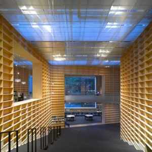 摄影师Edmund Sumner向我们展示了东京一所大学的图书馆,由日本Sou Fujimoto事务所设计,主要由玻璃板和木架构成。这个两层的图书馆位于武藏野艺术学院内,整体有存放书本的架子组成。漩涡形的楼梯填架子之间的入口。图书馆还包括一个位于地下的档案室。