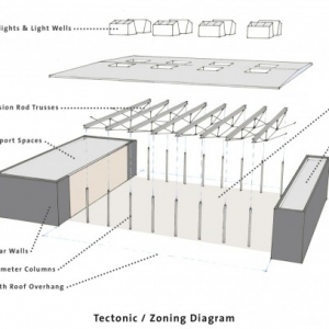 这个图书馆充当一个郊区的公共社区,它位于一个正在发展中的城镇中心,这里充满六十年代的商业建筑,停车空间和繁忙的高速路,图书馆的打造是为了回应社区空间需求,融合公共和商业空间,为了适应不断变化的图书馆服务内容,图书馆设计提供灵活,互动的,可适应性的楼层平面,尽量减少内部固定结构对于空间组织的阻挡。作为一个居民公共建筑,阅读室被设计成透明和开放的,延续的玻璃表皮覆盖于建筑之上,一个精致的由张力支撑的屋顶桁架系统横跨空间内部。