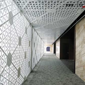 中式窗花与隔而不断的空间 员工餐厅,VIP包房等设置在主体建筑对面的综合楼内,大量中式元素的独特运用,比如经电脑刻花处理的白色高密度板拼合出沿窗的走廊墙面和天花,赋予走道在光线下呈现出传统文化中窗花般的剪影效果,为过道使用者提供一个充分驻足欣赏的原由。而提炼后的中式黑色檀木格栅线条简洁,清楚明了地界定每一桌的空间范围,隔而不断,光线在其间游移,带出时间的节奏与空间的序列。