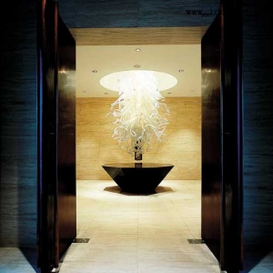 秘。偶尔敞开的门,露出一盏Chihuly式的吊灯,足以让一般的路人惊讶。虽是基于西雅图玻璃大师Chihuly的创意,模仿者也是玻璃艺术家,因此又包含了自己的创作。灯具似从水面涌向水底的一群生命体,降到刻着楼盘区位图的八边形黑色石台上,再顺着光芒向两边的区域溢出。