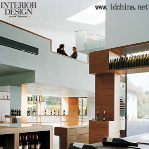 该建筑的开敞楼层被划分为各个功能区域。“通过其间的氛围和空间印象的交错延续,使人们能经历一段真正的红酒之旅。”客人们可以沿中心的一排陈列桌漫步前行,尽可感受建筑师们运用设计手段,组织和陈列大量商品。中档葡萄酒的陈列桌主要凸显出实用性,并带有一点pizzico的浪漫气息。每张陈列桌都能在下面放置整套的纸盒,顶部的凹槽内可盛放单个酒瓶,旁边还有相配的葡萄产量及葡萄园的介绍照片和文字。沿着墙壁的酒柜和搁架摆放着廉价的葡萄酒。最昂贵的酒类则储存在酒窖中。
