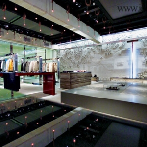 同样的一面墙延伸至被划分为多个空间的零售区中,这里是目前时尚店内最精彩的设计之处。此墙面的壁饰面积达50英尺宽,是米特区1:500的地形模型。它由柏林工业大学设计专业的学生创作而成,木模上糊上水泥而成。每隔2分钟,发光二极管散发出的白色光线将会照射到局部的壁饰上。