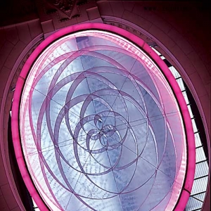 “比例是一个最重要的问题,”Dubuisson说:“大厅是作为纪念用的,为使空间不显得太空旷,我们需要找到一些体积足够大、足够轻的材料。”在寻找轻质材料的过程中,他们有了使用充气材料的想法。椭圆形的吊灯边缘是由充气的聚氯乙烯材料构成的,如内胎一样。