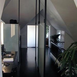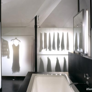 阁楼整个复杂的内部被拆掉,有充分的空间,设计光明和开放的套房。采用半透明玻璃面板分隔浴室和梳妆区。 简单的色彩,白色的威尼斯灰泥覆盖的墙壁和天花板,乌木染色橡木地板,和半透明的玻璃,营造戏剧效果的光与影,这是由点状光纤照明在地上,使得面板在夜间反射光。分别定制不锈钢衣杆,并搁置在梳妆区,卧室采用拉门。