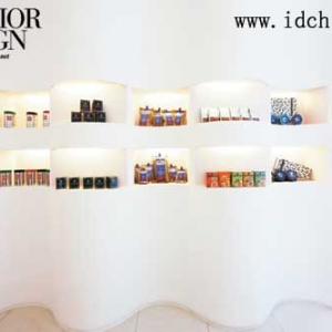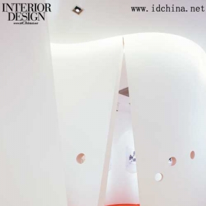 另外,中央部分的曲面墙端部与东西两壁相连。东西两壁与此构成了二元曲面,东西两壁开槽,作为茶品的展示台。西侧作为试饮区,依弧形墙面设沙发,墙端回旋设洗手池。曲面墙表面全部着乳白色,墙面镂空及开槽处着以粉红色,强调曲面。其他墙面及家具全部上红色,与曲面墙形成对比。在曲面墙的掩映下红色家具若隐若现,增加了空间的纵深感,从而从一定角度实现了视觉空间的扩展。