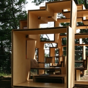 正弘原田(Masahiro Harada)和佐藤俊(Jun Sato)受邀来指导学生设计了日本Moku森林里的自助安装/房屋。 建筑师 Masahiro Harada:“结构工程师Jun Sato和我受邀指导学生,帮助他们的设计自助房子。他们的一部分作品,将要在Keio大学展出一年”。 一般而言,一座建筑存在许多铰链就会比较薄弱。因此在这种情况下,要求铰链的结构牢固。地面墙壁到天花板的各弯道处都加入胶合板面板材料。该项目是一个真正的建筑作品,里面配备功能家具。通常情况下,家具的选择取决于建筑本身建设和住宅居民。但在这里,椅子和桌子,床,架子采取不同高度。此次别具一格的设计,导致这座房子类似动物的巢一般。