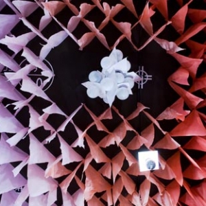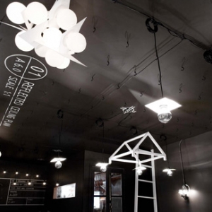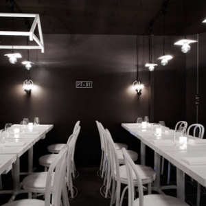 这家餐厅叫做“What Happens When”。地板、天花还有室内所有的墙壁都被刷成了黑色,同时家具与灯光都配合为白色。建筑的绘画与标志都被刷在墙上和天花上,每次室内设计变换的时候,它都会用带子映射在墙上。