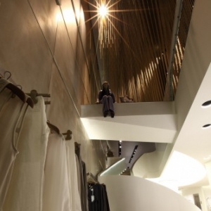 创造一个独特的,和谐放松的空间是这个项目的目的,数千条绳子从天花板上垂落,这些绳子之间的光影反射是空间对人留下的第一印象,这一效果构成商品的最佳背景支持,与普通的专卖店形成极大反差。楼梯将两个楼层自然相连,使人们觉得下楼是一个非常自然的举动。光的运用将楼梯转化为一个精致的雕塑。