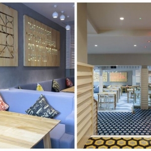 这座英国纽基冲浪酒吧的设计灵感来源于冲浪,设计师将冲浪这一元素注入到方案中,酒吧装修设计了一个明亮的空间。木质的桌椅,搭配柔和的照明,跳跃的黄色和蓝色点缀其中,一种活泼的感觉。