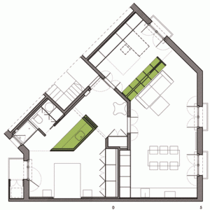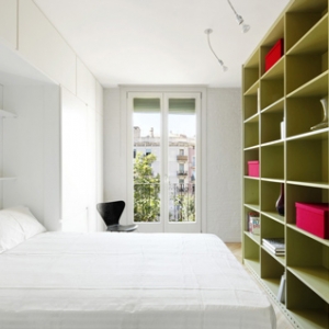 西班牙工作室M2arquitectura通过增加滑动分区,明亮绿色的表面和折叠在墙壁上的家具,将巴塞罗那一所公寓进行翻新。