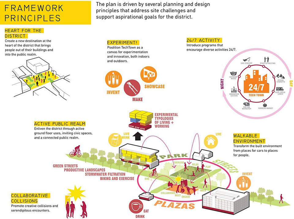 科技园愿景:长远目标是作为底特律的创新枢纽。复苏的公共领域将理念为基础的产业和充满活力的城市周边紧密联系在一起。