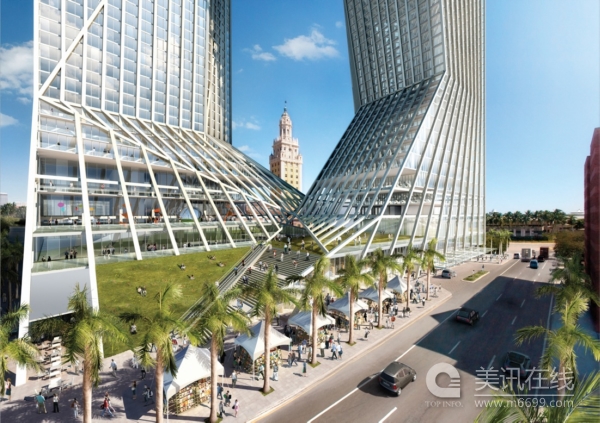 建筑师:Oppenheim Architecture + Design 地点:迈阿密,佛罗里达州,美国 项目团队:Chad Oppenheim, Carl Rmer, Eduardo Quintero, Carlos Ramos, Germán Brun, Juan López, Sebastian Velez, Robert Moehring, Gianpaolo Pietri, Helen Zhao, Hugo Mijares, Joshua Sacks, Lizmarie Esparza, Francisco Llado, Piero Valtolina, and Santhosh Shanmugam 开发商:Gregg Covin Development 客户:Miami Dade Community College 项目面积:250万平方英尺 项目年份:预期于2012年完工 图画:Dbox,Olalekan Jeyifous Oppenheim Architecture + Design建筑事务所为迈阿密达德学院设计了多功能的校园中心,这个项目将为这个热带城市的天际线增添一道风景。 整个项目不管是室内空间还是室外空间都非常具有流动性,建筑师也正是考虑到迈阿密的气候,运用到露天式的校园设计,包括连拱廊、方庭和广场。项目使用了丰富的材料和可持续性设计,其中有钢铁框架外壳系统、带玻璃铝窗的金属外墙系统、太阳能电池板屋顶、垂直通风通道和风力涡轮机。