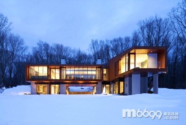 桥楼室别墅位于康涅狄格州肯特,建筑地区长300英尺,与不远处的肯特瀑布州立公园Housatonic河平行。公园内有许多美丽的瀑布和历史名桥。Joeb Moore + Partners Architects建筑事务所以周围环境给人的感觉和美丽的景观为出发点,对这座桥楼室进行了概念性的设计。 通过改变和反映地势较缓的基岩结构和较为活跃的溪流,建筑师设计了大概的建筑图表和建造方法,在这项设计中,建筑成了一个船舰和桥梁,屹立在周围景色迷人的景观和倾斜的地势之中。别墅是木制结构高高屹立在上,在起居室和餐厅两次都有山坡相支撑。 别墅的建造模式和主要的室内联系空间、起居室/餐厅两用空间现在两边都开放,与户外的草坪、谷底以及下面的Housatonic河相平行。起居室/餐厅区域和垂直的楼梯天井是很好的转写器或景观观察室,它们可以不断的调整室内室外的关系。 桥楼结构概念使得景观可以贯穿建筑的下方,这种悬浮的感觉刚好起到了“松配合”的效果,在大自然和建筑之间形成一种特殊的联系。 |