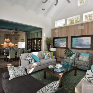- 美式蓝色调的海滨别墅装修设计,一进门,铺天盖地的绿松石袭来,走廊上的大幅照片记录了珍贵的过去,采用黑色木质边框显得十分重要与厚重。设计师对细节的把握十分到位,木质的吊顶,灯具照明,楼梯扶手与台阶,不同 ...