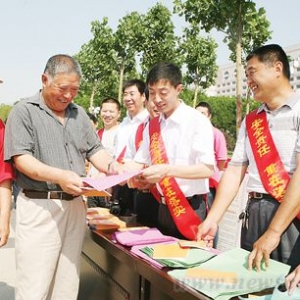 图为该区住建局工作人员正在设立的咨询服务台前向过路行人发放宣传材料